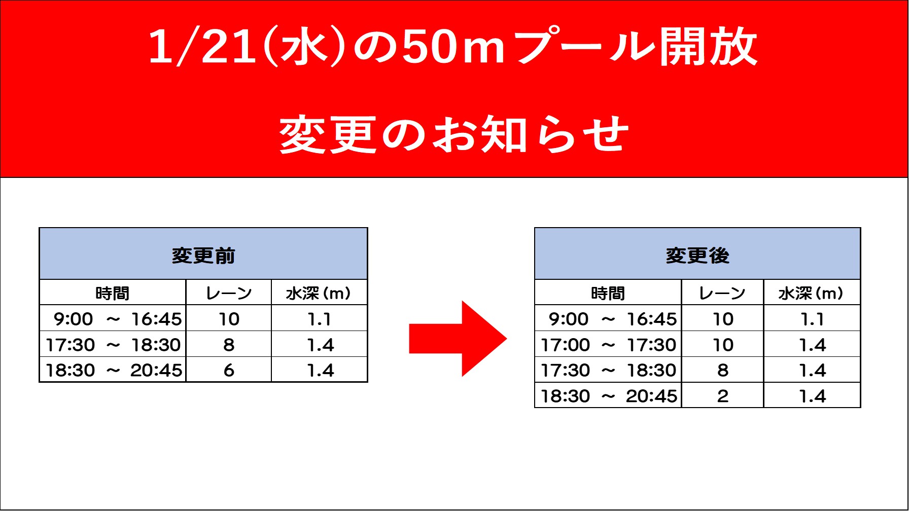 1/21の50mプールにおきまして一部変更となります。