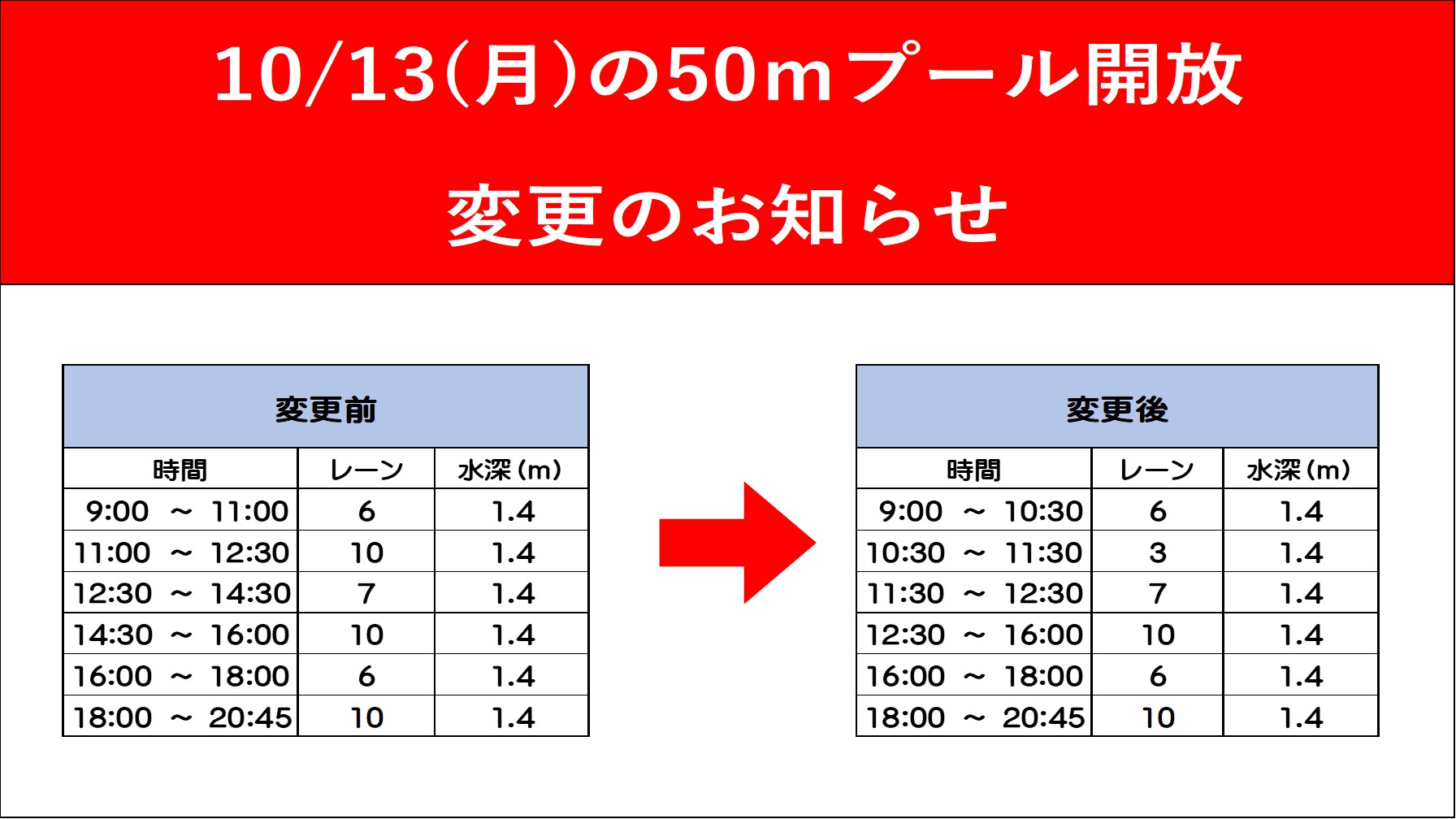 10/13の50mプールにおきまして一部変更となります。