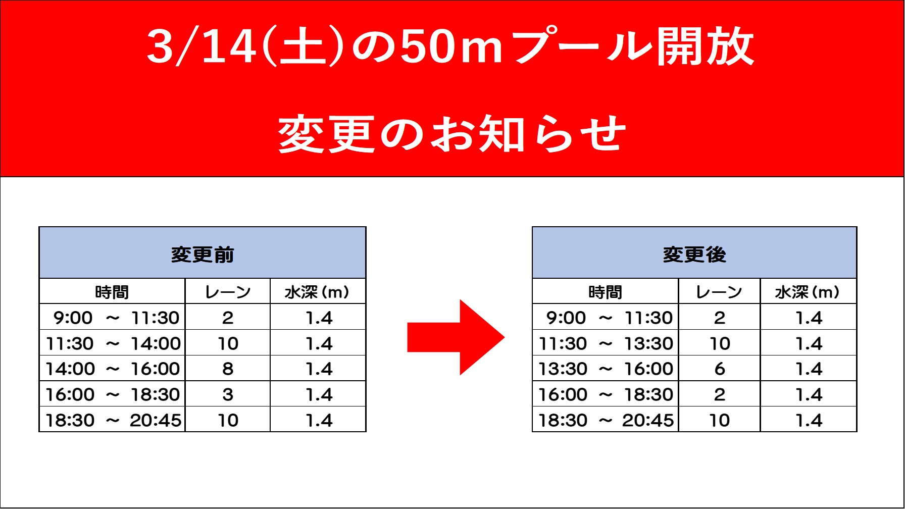 3/14の50mプールにおきまして一部変更となります。